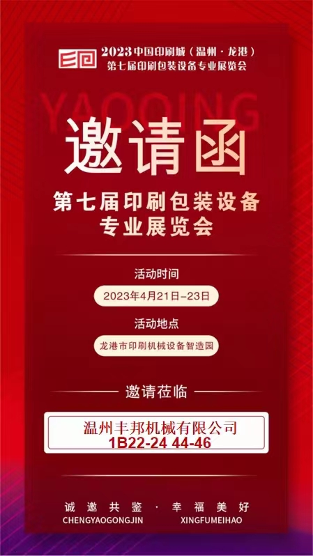 溫州豐邦機械有限公司參加2023中國印刷城溫州龍港第七屆印刷包裝設備專業展覽會展位號:1B22-24 44-46